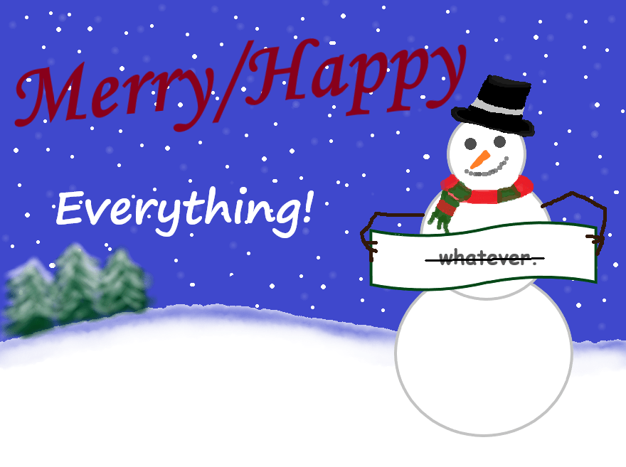 Level 10: The final echelon! This is simply a 3 x 5 index card stuffed sideways into a mangled envelope. It is crumpled. It is stained. Maybe it’s burned or torn. Is that a random staple? Who gives a flip?! Not you! There are no holly leaves or gingerbread decals. The only greeting is the word “whatever.” typed in lower-case comic sans. (That’s right!) This level comes with a coupon for a spa day and a free therapy session.
